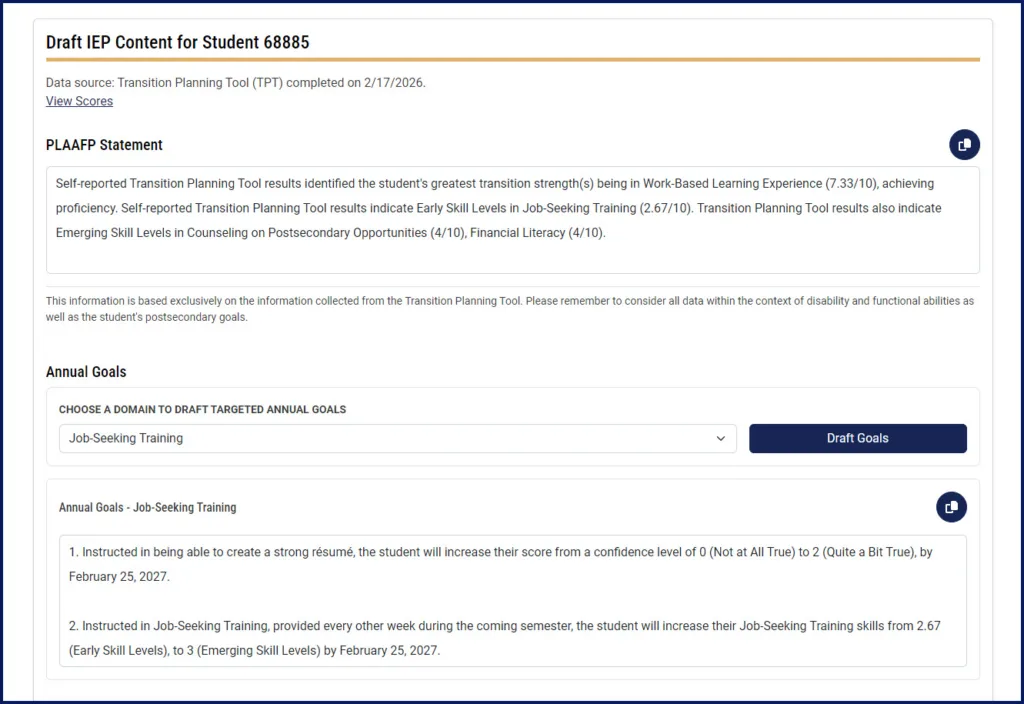 Using student-specific results from the Transition Planning Tool, the system generates draft language aligned to measurable postsecondary goals, transition services, and related IEP components. The output is grounded in the student’s actual transition assessment data; it is not a generic template. Each draft reflects the strengths and areas for growth identified through the assessment process.